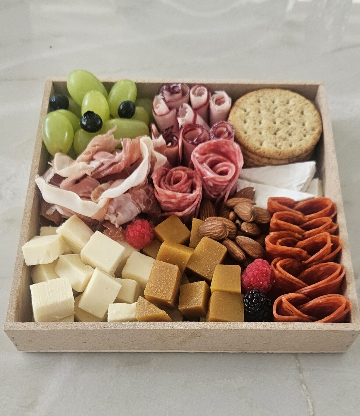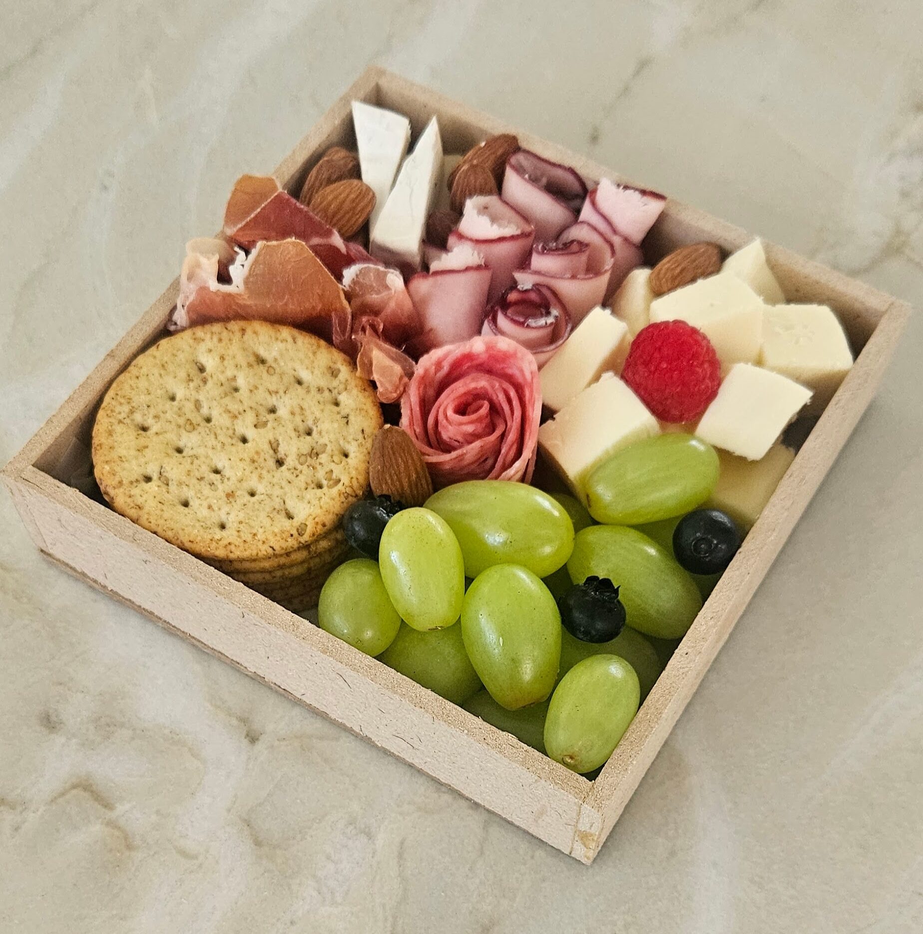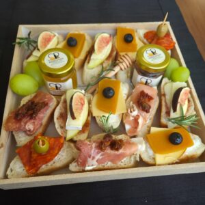 Salami o chorizo español, selva negra, queso manchego, queso brie o camembert, jamón serrano, galletas y fruta de temporada.