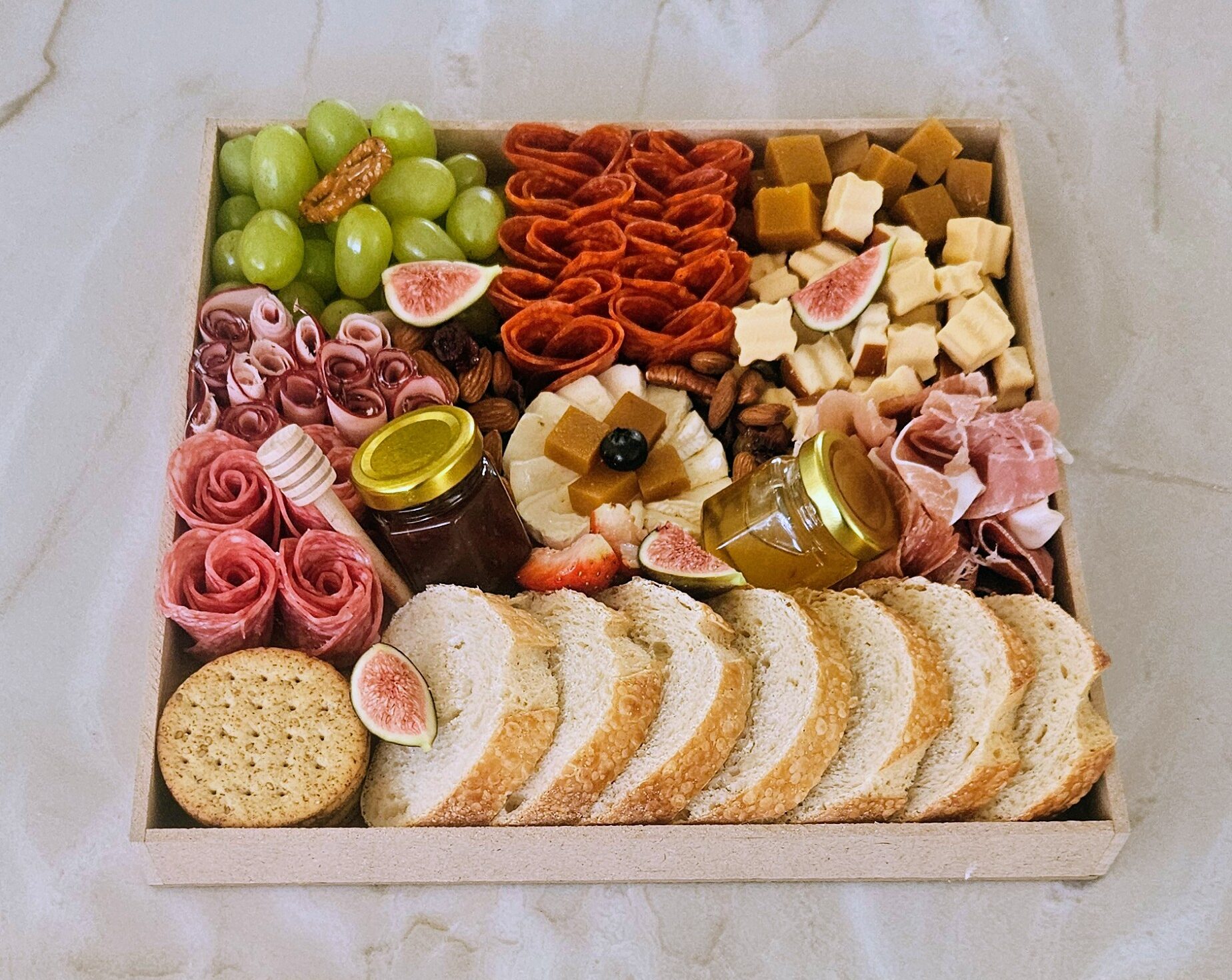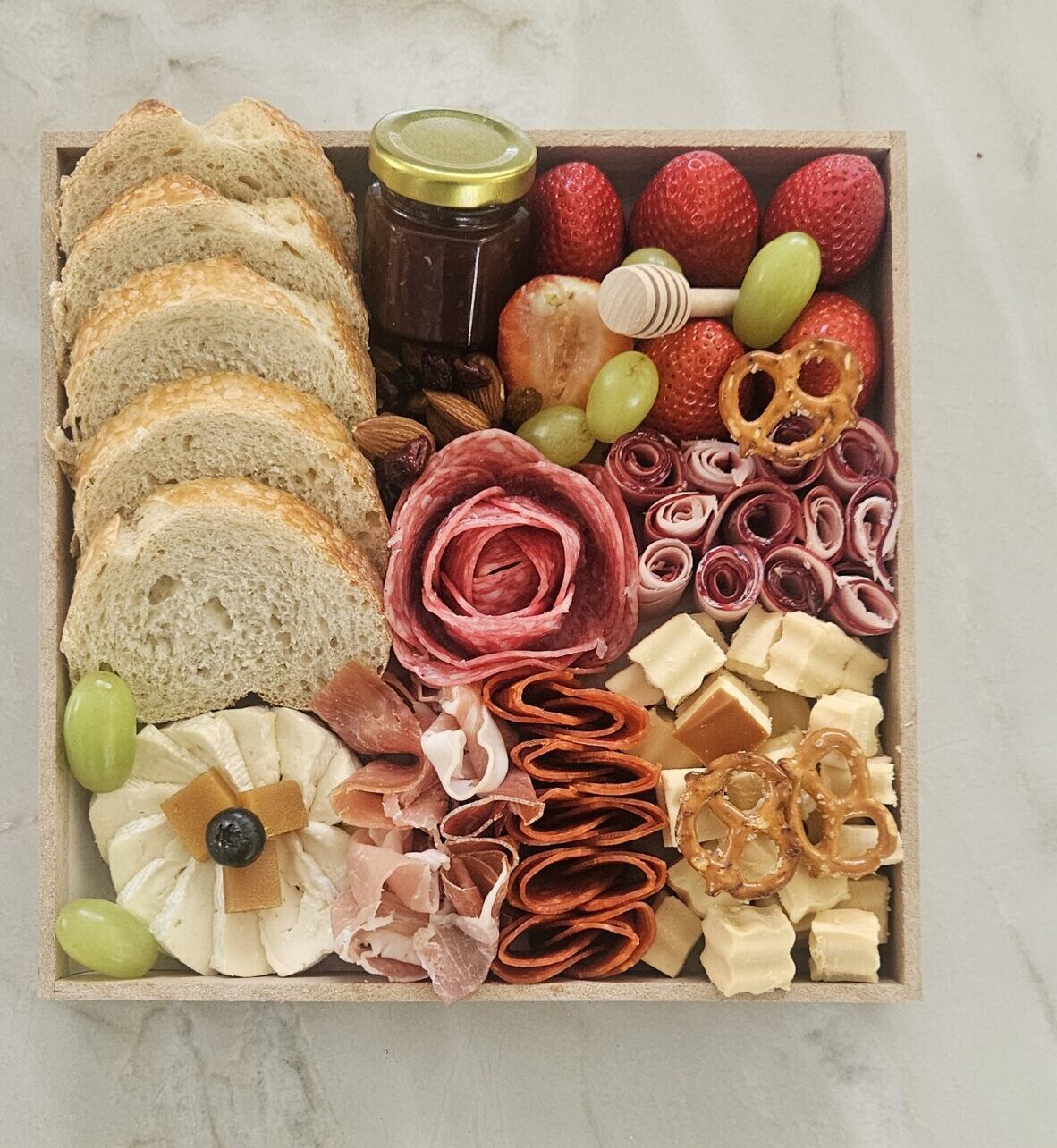 Salami, chorizo de pamplona, jamón serrano, selva negra, queso camembert o brie, queso gouda ahumado, queso cheddar, mermelada de frutos rojos con chipotle, miel, ate, fruta de temporada, almendras, nueces o pistaches, baguette y galletas.